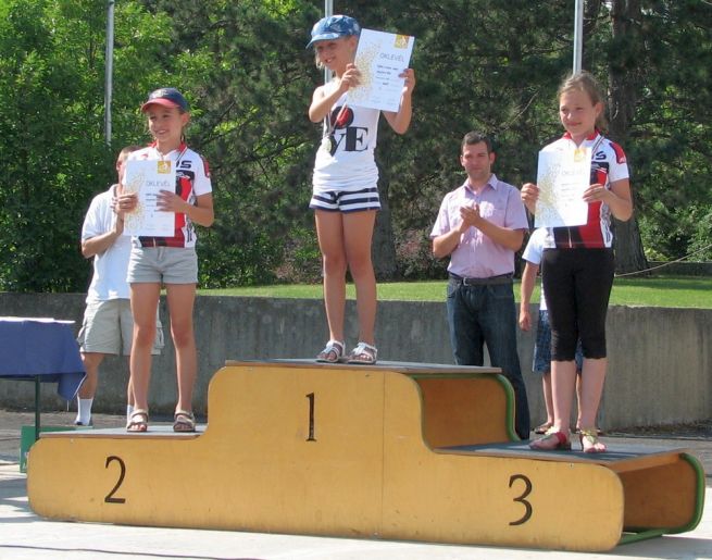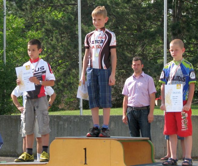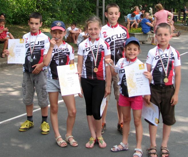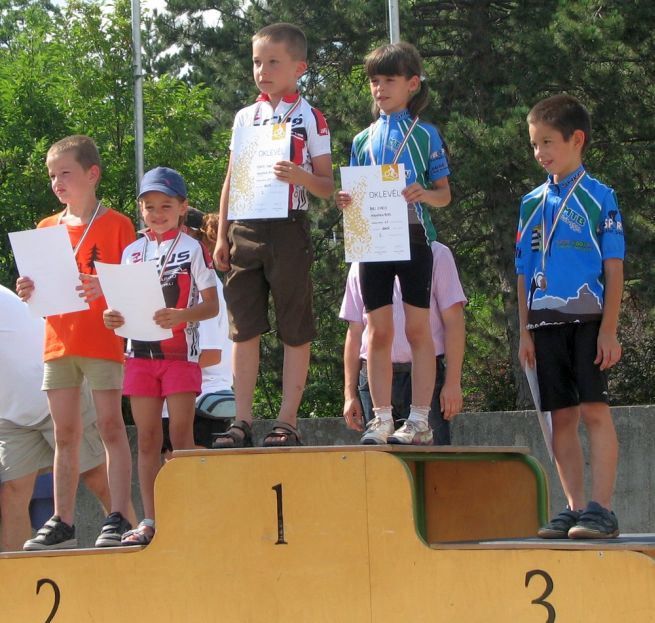 Eszterke az U9-es lányok közt ügyesen, kitartóan letekerte a 3-körét, Miklós hősiesen küzdött az első helyért, sikerült. Meg van az első olimpiai arany! Anna a cél egyenes előtti kanyarig élen állt az U11-es lányok közt, de az utolsó kanyarban Csenge belső íven bebújt mellé és hajszállal megnyerte a versenyt. Az első helyről századmásodpercek döntöttek. Zsófi ugyanebben a kategóriában kitartóan, ügyesen ment egészen a bronzéremig. Botondnak U11-ben csak a tavalyi országos bajnokot nem sikerült elkapnia. A srác az elején elhúzott utána már hiába ment vele azonos köröket, a hátrányt nem sikerült ledolgozni. A mezőnyből a többieket viszont szokás szerint rendesen otthagyta.
