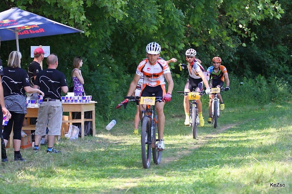 Egyre jobban élvezem a pályát, hátulról csak a középtávosok jönnek a nyakamra, meg persze Dénes már megint, de akkor most hol is vagyok, az elején? Rengeteg folyadék megy le, kettesével veszem el a poharakat néha. Aztán egy kis zavar a pályán, jönnek szemből, rossz az irány, Bálint fogja fejét, arccal ment neki a fának, de mutatja, hogy megvan OK, huh...utána kicsit óvatosabban mentünk. Telki frissítő előtt beláthatatlan bal kanyar után sorompó keresztben!!! Satufék, nézek hátra, Dénes jön, üvöltök neki is egy nagyot, észrevette, jól van…bele se mertem gondolni, hogy mi van, ha vki nem veszi észre és ááááhhh… Frissítőnél két pohár víz megint, aztán aszfaltszaggatás, Dénes felér, elmegy, megint… Próbálok nem leszakadni, de hiába hozok rajta lefelé, nem látom többet, már a hosszú emelkedőkön sem. A nagy körről kevesebb, mint két és fél órával fordulok, ez még középtávon is befért volna az elejére. Krisztitől megkaptam a kulacsot meg egy banánt, nagyon köszönöm! Aztán jönnek megint a hullámok. Tempó még mindig nagyon durva, lefeléken még annál is…néha éreztem, hogy most mindkét kerék egyszerre csúszott egy kicsit, de befordultam. Ennél jobban nem is lehetne határon „motorozni”…
