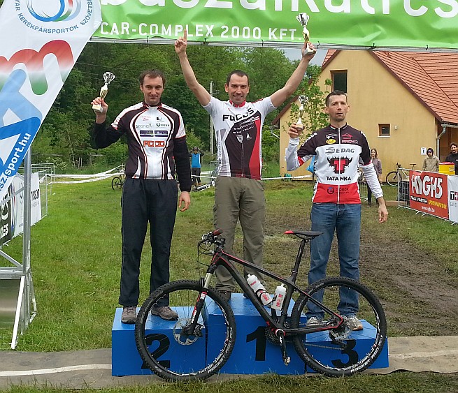 2014. május 20, 08:47Az előzetes híresztelésekkel ellentétben az idei első maraton kupafutam pályája közel sem volt olyan riasztó, mint sokan gondolták. Mindenesetre azt elérték vele, hogy nagyon családiasra sikerült a rendezvény. A hosszú távon mindössze 32-en álltak rajthoz és ebből 21-en értek célba értékelhető eredménnyel. A pesti légió most csak rám korlátozódott, mivel Viktor családi okok miatt nem jött, András és a bringája pedig még a múlt heti saras Vértes maratont pihente ki. Közben a közösségi oldalon sorra lehetett olvasni, hogy nevezések eladók, illetve a sok visszamondás miatt néhány elszánt magára maradó pedig épp útitársat keresett. Az egyik hasonlónál botlottam bele Hudák Szilvi hozzászólásába és már hívtam is telefonon. Gyors organizáció és másnap reggel már együtt autókáztunk Bakonybél felé. Közben folyamatosan csörög a telefon, András sok sikert kívánt, aztán Jokó, aki már ott volt és a nevezéseket vette át, illetve Hocsa, aki rögtön az esélyeket latolgatta. Nálam egy dobogó alja volt a cél, de hogy őt idézzem: „lehet az még fényesebb is!” :) Odafelé kellemesen elbeszélgettünk Szilvivel különféle szólós, duós és egyéb bringás élményekről, majd Zirctől hirtelen csend lett a kocsiban, mikor megláttuk a ködöt. Látótávolság 50m, a földeken áll a víz, sáros földutak…mi lesz itt? A parkolóban aztán gyors pacsi, kis bandázás és már raktuk is össze a technikát. Szilvi egy játszós bringát kapott Mikitől, először azt raktam össze. Szépen után állítottunk a fékeknek, hogy a sárban ne legyen vele gond. Aztán jött a FOCUS Raven 650B. Első igazán saras, maratonos bevetése lesz a mai, ahol várhatóan tengelyig kell gázolni a vízben. Ennek ellenére a „racing” kerekeket hagytam fent, kíváncsi voltam, hogy bírják majd a kiképzést. Vastagon olajoztunk, térdnadrág, aláöltöző, mez, karmelegítő és az „A” távon már nagyon bevált szélmellény volt a mai szett. Előző nap még sikerült kicsit helyrehoznom a tavalyi törött talpú cipőmet, ez volt az egyetlen igazán játszós cucc mára, de gondoltam, cuppogni a Hajagon ez is jó lesz. Jokó balszerencséjére otthon hagyta az első átütőtengelyét és mivel annyira új a cucc és ritka (Magura), ezért esélye sem volt, hogy vkinél lesz egy tartalék. Ő ezért sajnos nem rajtolt el, vigyázott a sátorra . Közben még Blazsó Marci is odajött hozzánk, épp rugót keresett a fékbetéteihez. Próbáltam neki legyártani egyet, de nekem csak Shimano volt és végül nem passzolt az Avidhoz, de aztán Dósa Esztiéknél talált egy jót. Egyébként ez volt az ok, ami miatt Marci lekéste a rajtot és nem ment át induláskor a chipkapun (automatikusan DSQ jár ilyenkor), de mentségére mondom, már a rajt utáni aszfaltoson felzárt az elejéhez (még menet közben is öltözködött) és együtt kezdték meg a Kőris emelkedőit Buzsóékkal. Az első mászáson szépen kategóriákba rendeződve mentünk fel. Meglepődve tapasztaltam, hogy a Master1-et én húzom elöl. Pulzus határon, Robika előttem, még épp látom a ködben. Fityisz jobbról elmegy egysebességes gépével. Neki az volt az optimális fordulat, de aztán Vas Peti rángatta meg a sort az aszfalton, így hamar szétszakadtunk. Szokásos tolás a csúcs előtti köves emelkedőn, majd gyors frissítés. Lefelé Nedjalkov Balázzsal mentünk, előreengedtem a fullyval. Próbáltam követni, ami egész jól ment az elején, de aztán bekaptam egy sárgombócot a szemüveg alá és semmit sem láttam. Mindezt épp egy keresztbe lévő rönk előtt, amin normál esetben csak átgurulok, de itt a sáros szememen és párás szemüvegen keresztül alig láttam. Első perec, de igazából csak eldőltem. Aztán felálltam, eresztem tovább, de jött egy gyökeres kicsit meredek, de annál csúszósabb kanyar. Na itt sikerült egy „tripla Axelt” bemutatnom, beborultam rendesen a susnyásba. Nyereg elfordult, kulacs kiesett. Gyorsan felpattantam, közben jön Vas Peti, kiabálok neki, hogy vigyázz, ő megúszta. Nyerget visszaütöm, gurulok tovább az aljáig. Robika lelassult , bepárásodott ő is, Boda Peti az út szélén szerelt. Aszfalton Balázs előttem jó 500méterrel. Időfutam üzemmód és nemsokára már egymás mögött nyomjuk. Közben látom, hogy a hátsó váltó behajlott a boruláskor. Ok, majd emelkedő előtt szerelek, így is lett, a krumpliföld előtti mászáson gyorsan kihajlítottam a kanalat. Utána még kellett vagy 20-30 km, mire kitapasztaltam, melyik fokozat hol működik. Inkább elöl váltottam és hátul csak a középső 5-6 fokozatot használtam. Ezt még tudtam bowdenfeszesség állítása nélkül váltani. Balázs kérdezte, hogy nem hiányzik a fully? Hát…a lefeléken igen, az egy egészen más élmény, de a merev váz felfelé teljesen más dimenzió… Mivel mi ketten M1-ben voltunk, szépen összedolgoztunk. Együtt mentünk át a Cuha völgyén. A víz elég magas volt, néha tengelyig ért és sodrás is volt rendesen, de mindegyiken át tudtunk tekerni gond nélkül. Nem is értettem a félelmet és a pánikot a rajtnál. Közben összeszedtük Zoránt, akinek a hideg vízben elment a nyomás a kerekéből. Ez egyébként egy tipikus probléma ezen a versenyen. Az első 4-5 átkelésnél a pár fokos vízben annyira lehűlnek a kerekek, hogy a nyomás kritikusan lecsökken. A lapos gumikkal aztán a 6-7. átkelésnél gyorsan be lehet szedni a felütést. Viszont az is igaz, ha nem szállsz le, perceket lehet nyerni csak az átkelésekkel! Bár Zorán defekt gátló tejjel ment, úgy tűnik a jelenség ott is fennáll. Aztán Zorán elhúz, Balázs pedig megállt, de olyan hirtelen, hogy majdnem belementem hátulról. Legközelebb azért ezt előre kérem jelezni! :) Később Zorán is szerel az út szélén. Lassan elfogy a