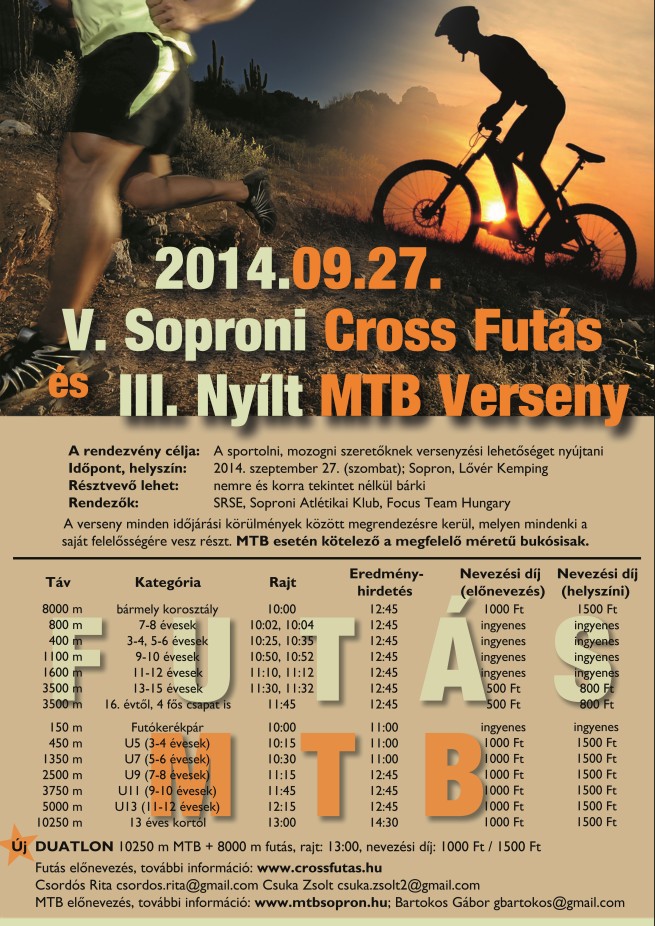 A verseny helye: Sopron, Lővér kemping A verseny ideje: 2014. szeptember 27. (szombat) 10.00-Előnevezés 2014. szeptember 25-én lezárult. Helyszíni nevezés: a verseny napján 7.30- minden rajt előtt 15 percig Előnevezési díj: 1000 Ft, amely előnevezés esetén is a helyszínen fizetendő. Helyszíni nevezési díj: 1500 Ft A futókerékpáros versenyen való indulás ingyenes. A indulás feltétele a szülői felelősség-vállalási nyilatkozat elfogadása a nevezési lapon. Kötelező kellékek: megfelelő méretű bukósisak! Elfogadott előnevezések