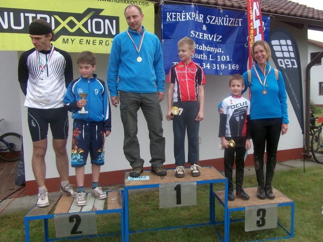 A tavalyi aranyérme után Gergő örömmel várta az idei Vértes Maratont. Útközben szakadt az eső , úgyhogy felkészültünk a dagonyázásra. Mi hárman mentünk úgy tervezve hogy anya kíséri Gergőt és benevezünk a családi kategóriába is. Én master1-ben sároztam össze magam. Képviseltette magát még Kádár család, és Bartokos család is. Gergő anyukája most tekert sárban először sikerült is párszor eldobnia a bringáját. 13 km es volt a családi és kinderpálya. 23 a rövidtáv. Nem műhold szerint ez 17 és 24,5 volt a valóságban. A pályákon bokáig érő ragacsos sár volt Gergő mosolygó arcán és fogain otthagyta nyomát. A sár lassította a haladást persze, tavaly 1 óra 7 perc helyett 1 ó 4 perc lett. De így is aranyérmes lett U9-ben, a második egyben utolsó kis srác ideje fél órával több volt. Anna U11-ben ezüstös sáros lett, családiban pedig bronz lett Gergő és anyukája, kb 1 századmásodpercre lemaradva a második helyről. Kádárék Eszterrel és Bartokos-ék Flórával is sikerrel végigmentek a csúszós pályán. Bartokos Boti is ügyesen végigment a rövid távon de 10 perc kiesett technikai problémák miatt. Az óvodásfutam eltolódott ezért Kádár Lőrinc kifáradt és nem várta meg, de előtte letekert pár kilométert. Jó volt jövőre ott a helyünk!